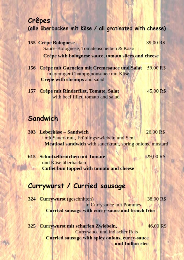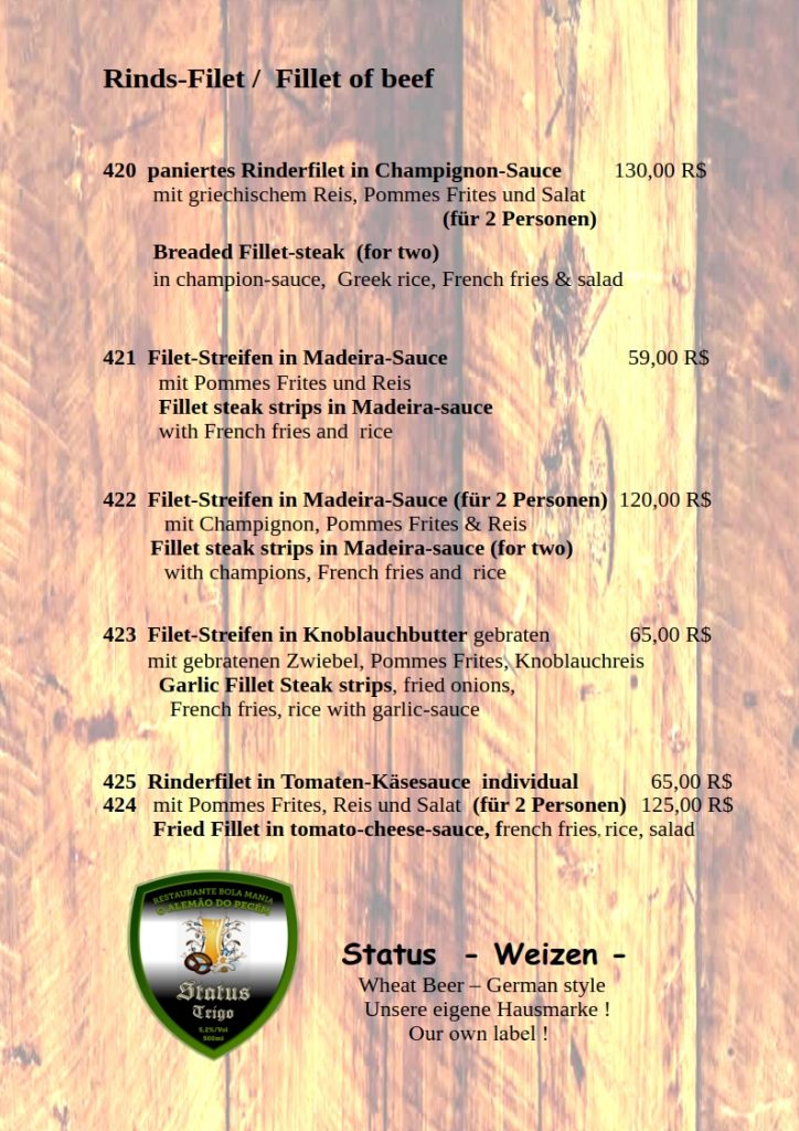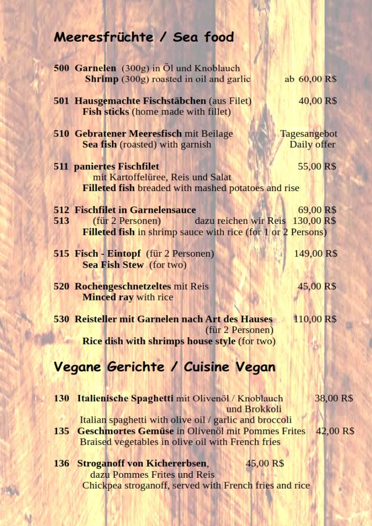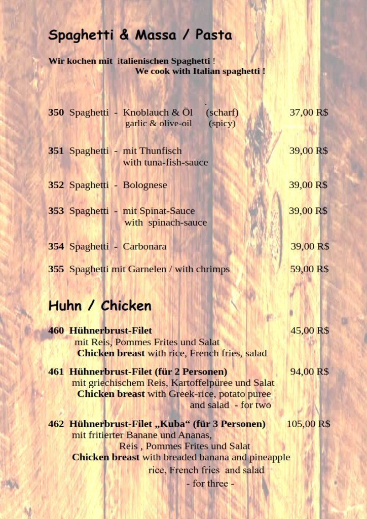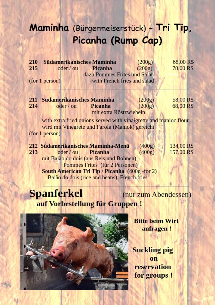 Menü Start Home Speisekarte Speisekarte/Menu Aktuelles und Events Info’s & Kontakt Speisekarte (deutsch) / Menu (english) Unser Bier / Wein Suppen / Vorspeisen Crêpes, Sandwich, Currywurst, Spaghetti, Huhn, Deutsche Küche Vom Rind Meeresfrüchte Spanferkel Beilagen,Salate und Nachtisch nach oben nach oben nach oben nach oben Lust auf lecker Spanferkel ?Sie können bei uns für Gruppen ab 10 Personen ein Ferkel entsprechender Gröβe vorbestellen ! Dieses Angebot gilt nur für das Abendessen ! Wir servieren es komplett mit einem reichlichen Angebot an typischen Beilagen Ihrer Wahl am Tisch.Termin und Preis (entsprechend der Gröβe und der Beilagen) sprechen Sie bitte mit uns ab. nach oben
